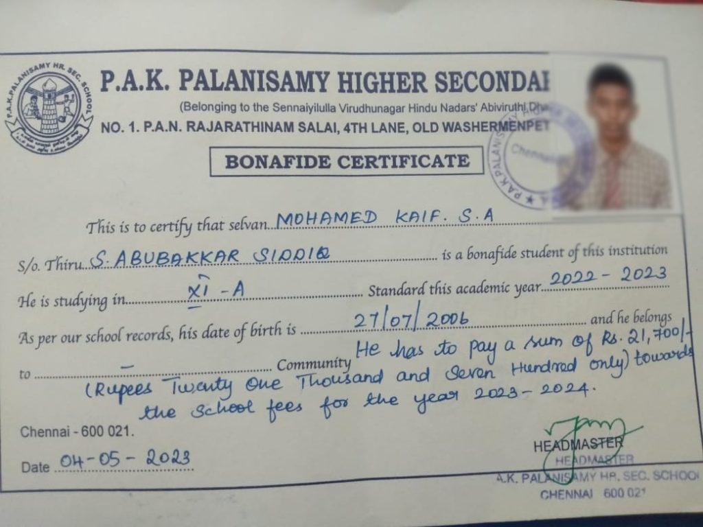 Mohamed Kaif is a student of XI class at P.A.K Palanisamy Higher Secondary School in Old Washermenpet, Chennai. Despite facing financial struggles, Kaif is determined to continue his education and build a better future for himself and his family. Unfortunately, due to his family’s financial situation, Kaif has accumulated school fee dues of up to ₹21,700, making it difficult for him to continue his studies.